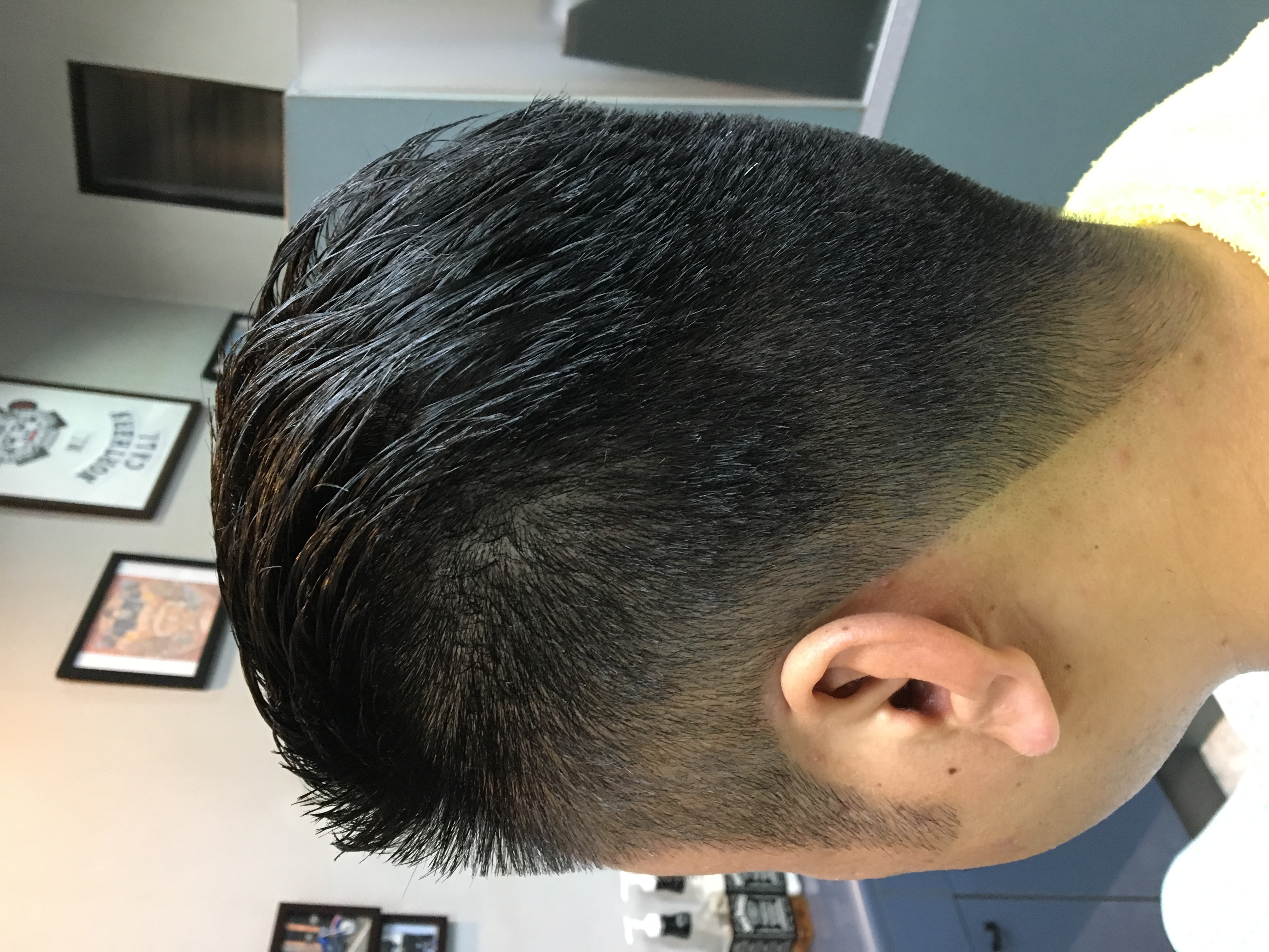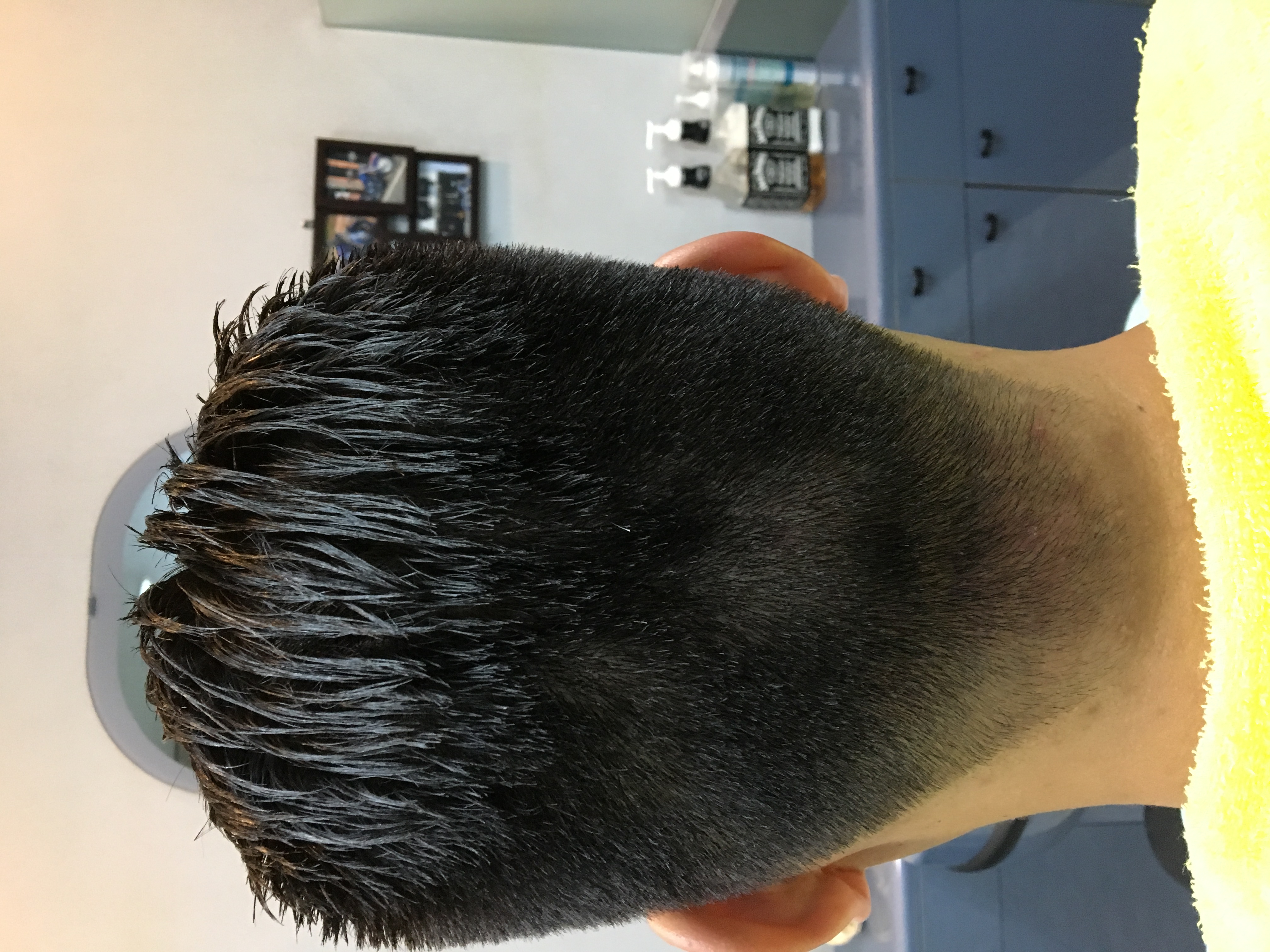 最近は、もう少し低い位置で仕上げる事が多いですが暑がりのお客さんで今から暑くなるので高い位置まで刈り上げてます
