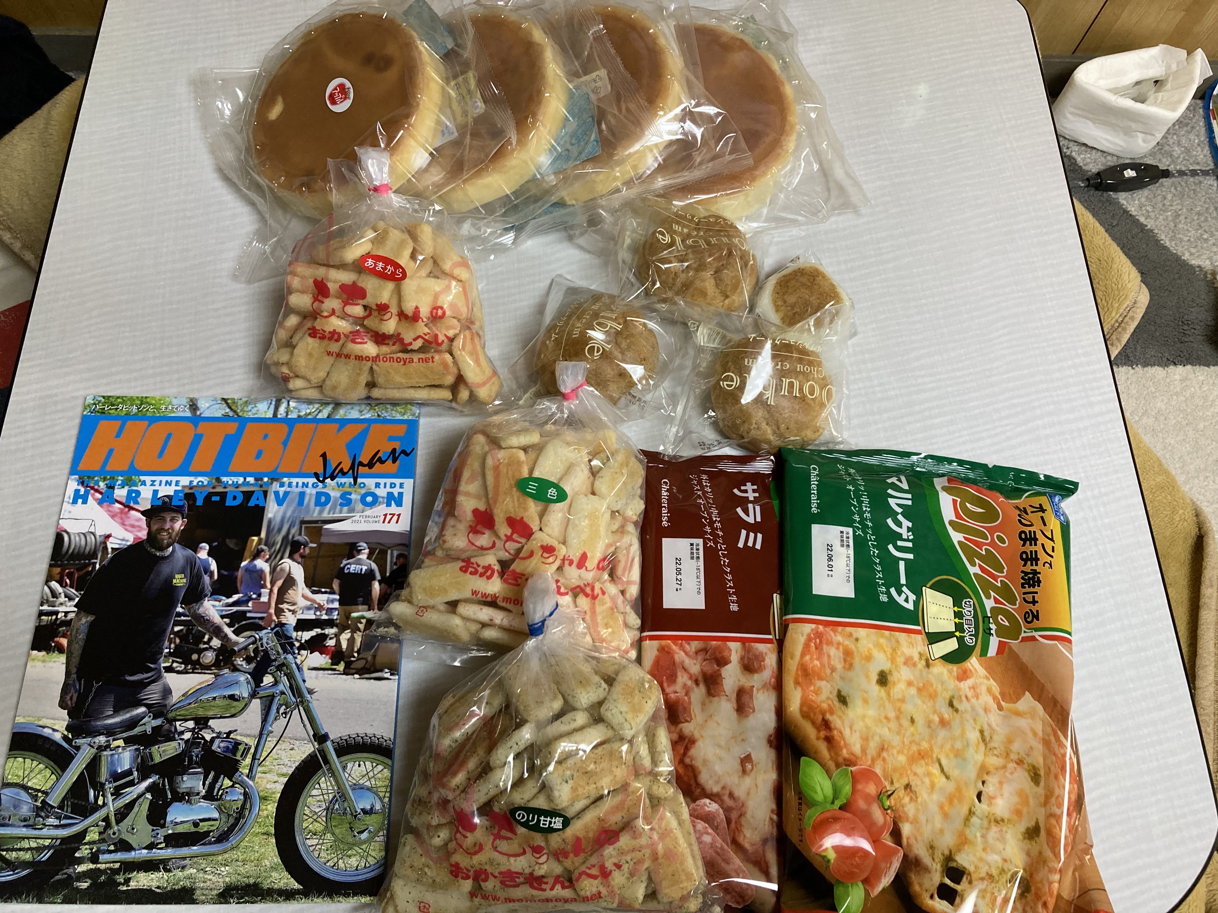 今回の戦利品、おかきにチーズケーキ、シュークリームとピザ、ホットバイク誌
